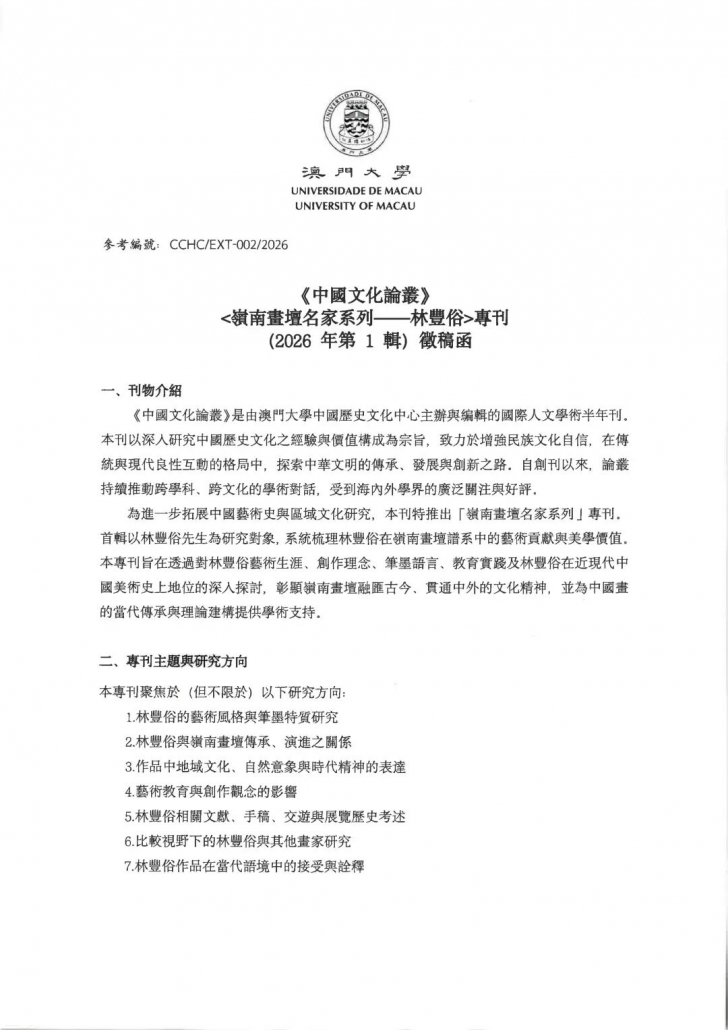 《中國文化論叢》<嶺南畫壇名家系列——林豐俗>專刊(2026年第1輯)徵稿函