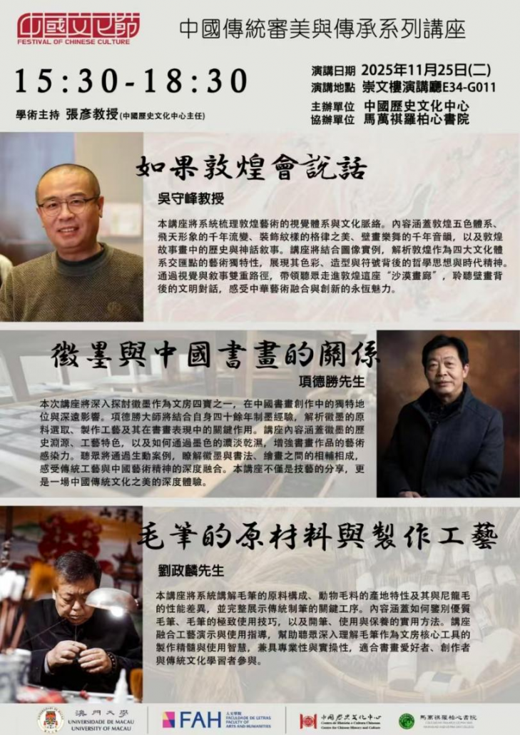 澳門大學中國歷史文化中心於11月25日舉辦中國傳統審美與傳承系列講座三場,分別是:吳守峰老師以“如果敦煌會說話”為題,系統解析敦煌藝術的色彩體系、飛天流變與紋樣格律,展現其作為四大文明交匯點的視覺魅力;項德勝老師結合四十年制墨經驗,講述“徽墨與中國書畫的關係”,闡述墨色濃淡如何影響書畫藝術表現;劉政麟老師則通過工藝演示,詳解“毛筆的原材料與製作工藝”,分享鑒別、使用與保養毛筆的實用智慧。