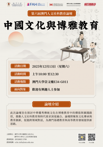 活 動 資 料 活動名稱 : 中國文化與博雅教育 地點 : 澳門大學崇文樓G011 主辦單位 : 澳門大學中國歷史文化中心 日期 : 2025年12月13日 對…