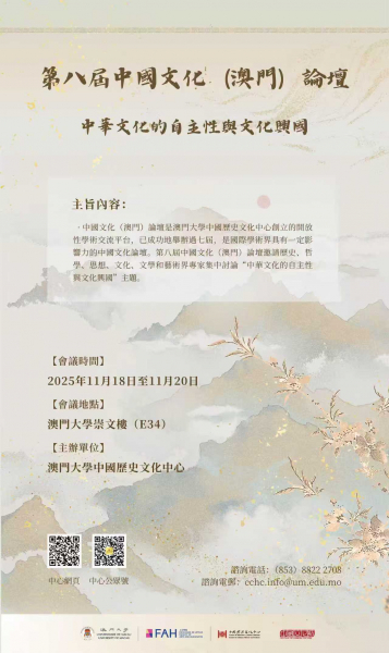 活 動 資 料 活動名稱 : 第八屆中國文化(澳門)論壇 地點 : 澳門大學崇文樓 主辦單位 : 澳門大學中國歷史文化中心 日期 : 2025年11月18日-2…