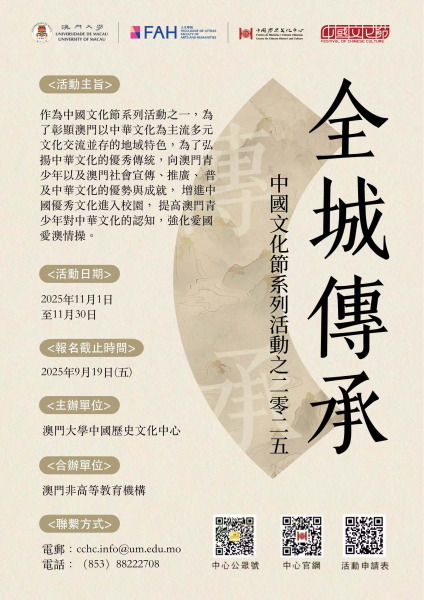 活 動 資 料 活動名稱 : 中國文化節系列活動之二零二五:全城傳承 地點 : 澳門非高等教育機構 主辦單位 : 澳門大學中國歷史文化中心 日期 : 2025年…